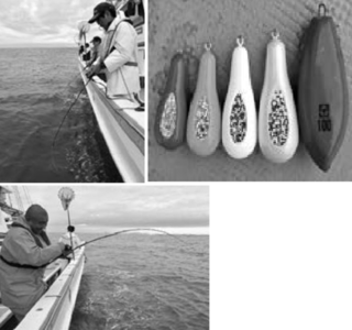(左上) 道糸が入り込む舷で釣りづらいと思ったらオモリを重くして調整しよう。(右上)主に使うオモリは60号と80号だが、40~100号まで豊富に用意しておいたほうがいい 。(左下)道糸が払い出す舷では巻き上げにも一層の負荷がかかる。