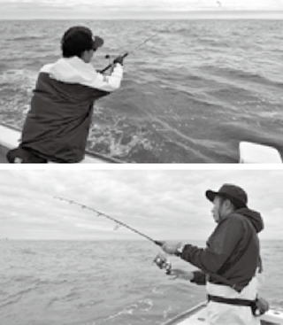 投入は、道糸が払い出す側なら船下に、入り込む側ならできるだけ遠くにキャストする。