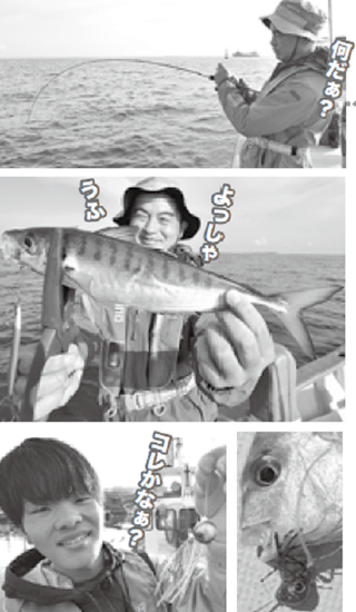(上)どうやって釣るのよ?と言っている先から、ジグに掛かってきたのは・・・。(中)大きなアジ。宙層で頻繁にアタってきた。(左下)点で攻めるテンヤ、線で探るタイラバ。今日はタイラバのほうがアタリが多いのでは?と読む。(右下)蒼一郎はタイラバでマダイをロックオン。