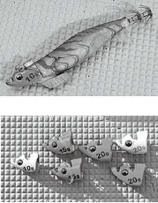 ・中オモリ=釣具店でアオリイカのシャクリ釣り用「中オモリ」として販売。指定号数は船宿によって6~15号と幅があり、事前確認が必要。