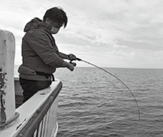 須田寿さん。取材日はピンク&マーブルの餌木によく乗った