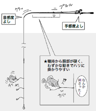 ④ ①~③までの手順の途中でアタリが出たら、その場で動きを止め、ひと呼吸食わせの間を取ってから小さく聞き上げてみる。ここで明瞭にアタったらスーッと竿を立てながら素早くリールを巻き(巻き合わせ)、ハリに乗せるイメージでカワハギを掛けにいく。