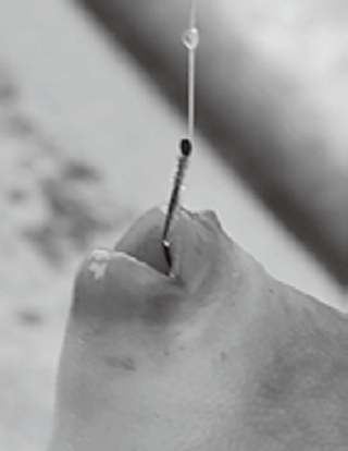 船ベリに置いてエサを付けているとふいに転がり落ちて、オモリに引きずられた仕掛けのハリが手に突き刺さってしまうことがある。