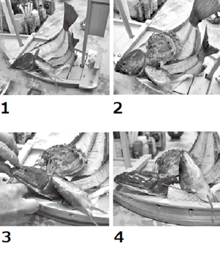 8.尾を曲げる際は背骨を一カ所「ポクッ」と音がするまで力を入れて折る。