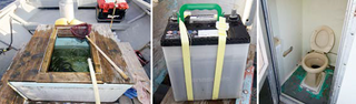 (左)船の前後3カ所に生きイワシ用のイケスあり。(真ん中)バッテリーの貸し出しあり。(右)船後部に水洗トイレ。