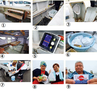 ①船の乗り降りは昇降台があるから安心②各釣り座に散水ホース③小トイレは船の前後に2カ所。大は後部キャビン内④船体前後に広いキャビンあり⑤探見丸も搭載している⑥ゴミは中身を空にして分別、バケツにまとめる⑦帰港後は軽トラに用意された水タンクで手洗いできる⑧お茶と軽食のサービスあり⑨ポイントカードのサービスも