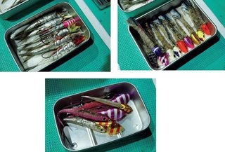 (左)定番のイワシエサ (右)サバとサンマ (下)ワームも試してみたが…