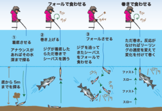 底付近で群れているシーバスに対して巻き上げでジグを追わせ、ジグがヒラッと落ちたときに食わせる。