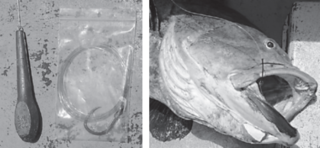 (左)オモリ200号。仕掛けはバラけないようジッパー付きの袋などに入れておこう(右)ハリを丸飲みされて切られないようハリスは強化チューブで補強しておく