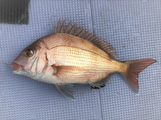 マダイ特有の小気味よい引き込みを堪能し浮上したのは、桜色がきれいな1kgクラス。