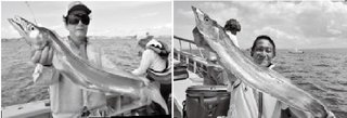 (右)指幅5本クラスでも全長を測ると100~105センチほどのことが多い(左)取材二日目には指幅5本少々の良型がけっこう釣れたが、ドラ ゴンと呼ぶにはもう一声