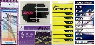 (左)今回、指幅基準を探るうえで参考にさせてもらったのがリフィッシュのタチウオ専用スケール「タチオキクン フィンガーポケット」(右4つ)各社がノベルティーなどで配布しているドラゴンステッカー。釣具店で見つけたらぜひゲットしたい