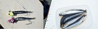 (左)テンヤによってもアタリの数は変わるという。宮澤さんが使っていたタングステン製テンヤには村上船長も太鼓判を押していた(右)上丸では上質なイワシエサを用意してくれている