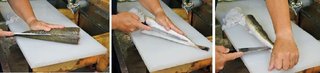 (左、中)①胴、腹側に切れ目、(右)②血合骨を断つ