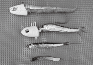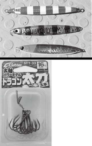 ジグに関しては巻頭カラーでも紹介したとおり、宮川丸でドラゴンの実績があるのはジャッカルのアンチョビメタルTYPE‐I、ヤマリアのメタルフリッカー太刀魚SP、ティムコのオーシャンドミネーターセンターバランスなど。