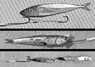 (上)こんな感じで小魚エサなどの体内にインナーフックを埋め込む(中央)エラからインナーフックを押し込むが、脇から出てしまったら外側に掛ければいい(下)切り身エサでも使える。船のサバエサを2枚付けにしてみたが、小型しか釣れなかった