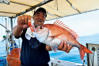 オレンジや赤色のゴム片を足したり、ときにエビエサも付けて、マダイ・チダイはもちろん、底物のアコウ(キジハタ)やカサゴほか色いろと釣ったらしい。