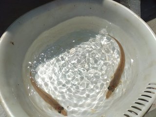 たらいに海水を張っておき、釣れたキスはその中に話しておきます。